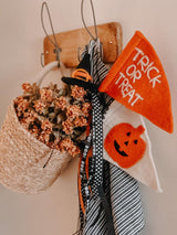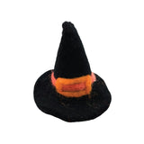 Single felt witch hat ornament with string for hanging. Comes with an orange band or off white band.